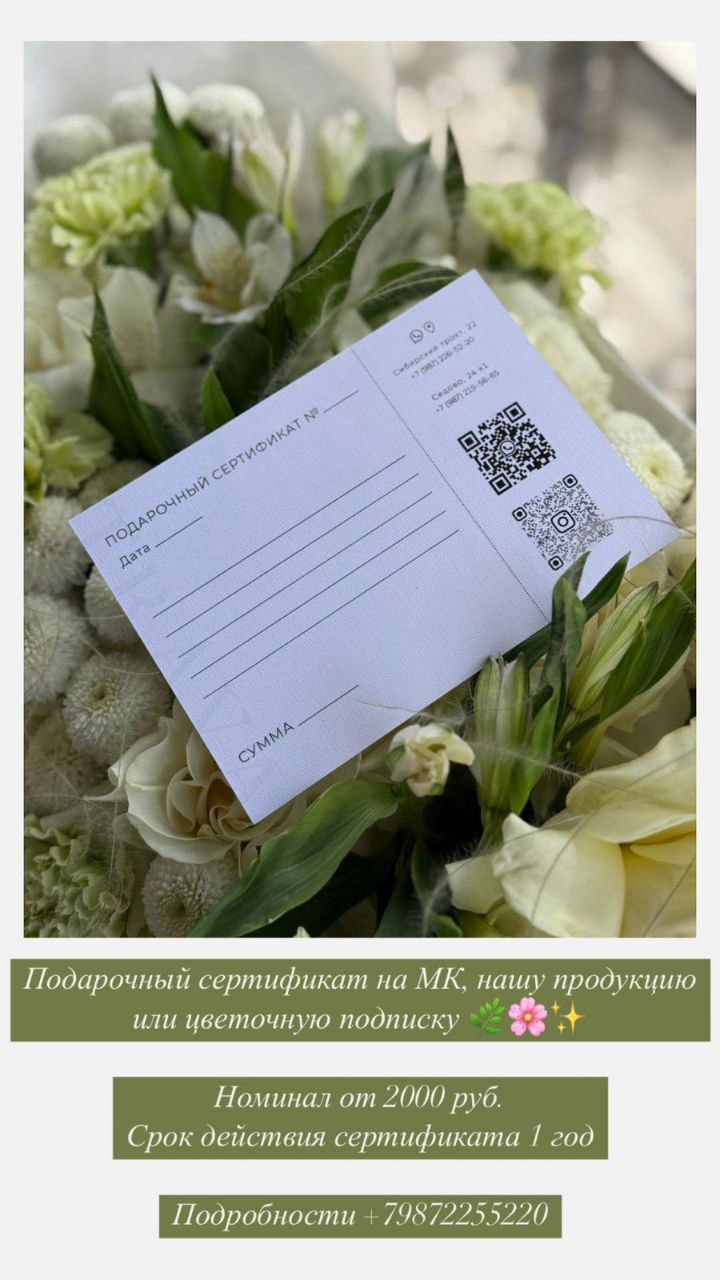 Подарочный сертификат на мастер класс, продукцию или цветочную подписку. Срок действия сертификата 12 месяцев с момента приобретения.